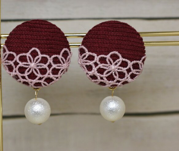 ピンクレース×パールぶら下がりピアス レッド 揺れるくるみボタン ピアス 32【 ヘアアクセサリー 上品 カジュアル 大人っぽい ギフト 誕生日 プレゼント おしゃれ おうち ポイント消化 入学 入園 式 母の日 こどもの日 子供 】
